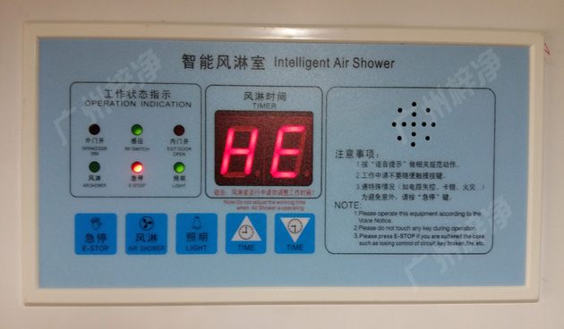 第三步:風(fēng)淋室控制器面板風(fēng)淋時間顯示區(qū)會出現(xiàn)”HE”字符,松開急停(看下圖);