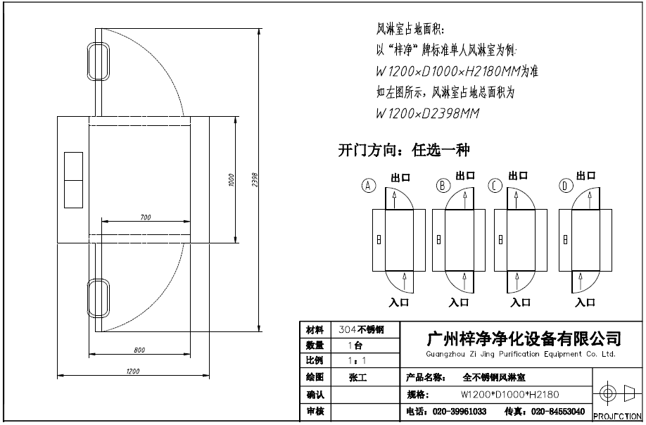 上圖為風淋室的占地面積,我們以“梓凈”牌單人雙吹風淋室為例,W1200*D1000*H2180MM,如上圖所示,風淋室的占地面積為W1200*H2398MM,這樣我們在凈化廠房設計時就可以把風淋室的占地面積留出來,供風淋室安裝,當然,也有特殊情況,要做異形風淋室,那么就來電咨詢我們吧~~~