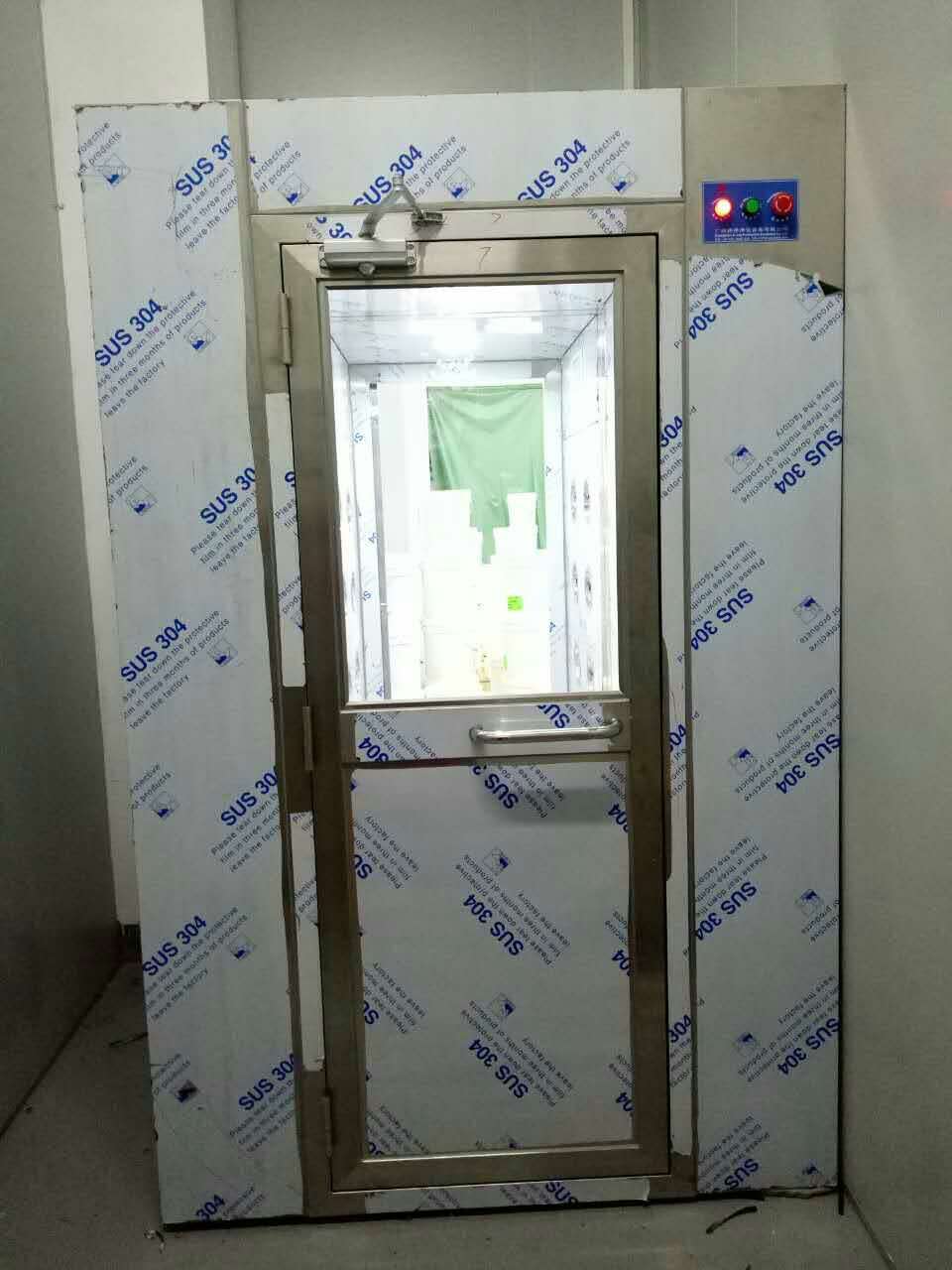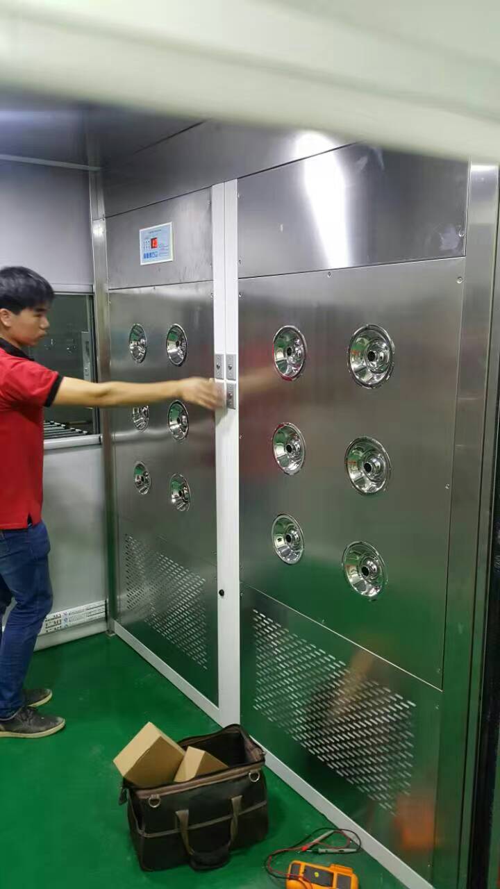 2、打開外門,內門上電子互鎖,風淋室照明燈點亮,工作指示燈亮,人走進風淋室,關上外門,語音提示:“你好,請站在感應區(qū)內”。經(jīng)外線智能系統(tǒng)開始檢測是否有人在風淋室,如檢測到有人,系統(tǒng)即轉入風淋過程中。