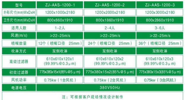 臭氧殺菌風(fēng)淋室標(biāo)準(zhǔn)規(guī)格尺寸及其它參數(shù):