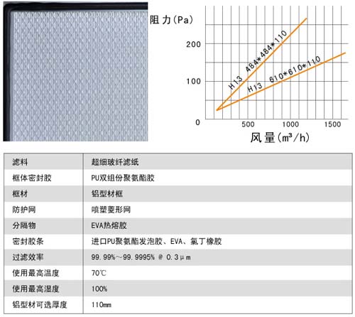 規(guī)格尺寸(W×H×D)(mm)484×484×150》風(fēng)量530;過濾面積(m2)6.0≥ 容塵量(g)320≥ 初阻力(面風(fēng)速0.5m/s時)=200Pa;終阻力400Pa;過濾效率0.5μm,F(xiàn)6-H12。