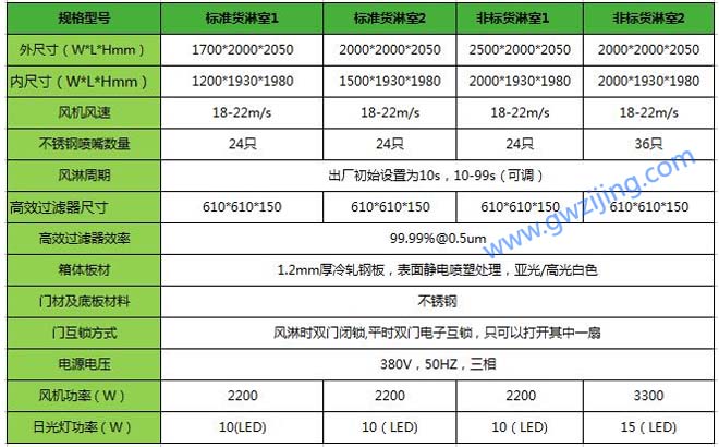 9、貨淋室安裝有先進(jìn)的電子高科技語音提示系統(tǒng),提示完成整個吹淋過程,有利于提高凈化的效果。貨物風(fēng)淋室與人淋風(fēng)淋室區(qū)別圖貨物風(fēng)淋室規(guī)格尺寸及技術(shù)參數(shù):貨物風(fēng)淋室規(guī)格尺寸及技術(shù)參數(shù)