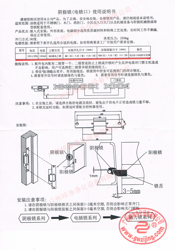 1.請在陰極鎖與陽極鎖鎖舌之間保留l一2毫米空隙,否則會影響正常開門。